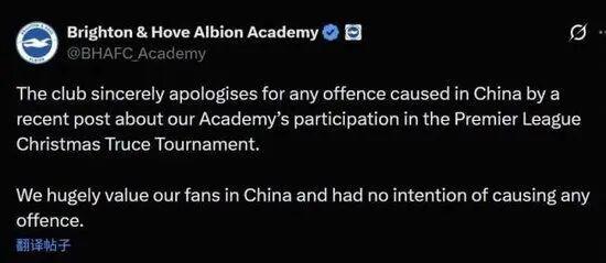 11月29日,布莱顿俱乐部青训学院发布声明,表示“我们极为珍视中国球迷,绝非有意冒犯”,并对该帖子在中国造成的冒犯致以诚挚的歉意。